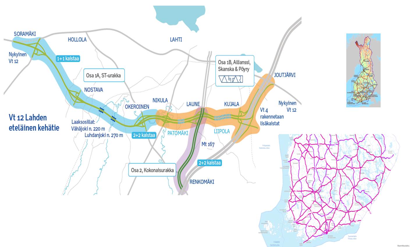 Main Road 12, the Southern Ring Road project of Lahti, aims to ensure a smoother and safer transport on Main Road 12 and to promote the development of land use and business life throughout the Lahti region. The project includes the construction of the Southern Ring Road 12 of Lahti and the improvement of the Lahti Southern Entrance Road 167.